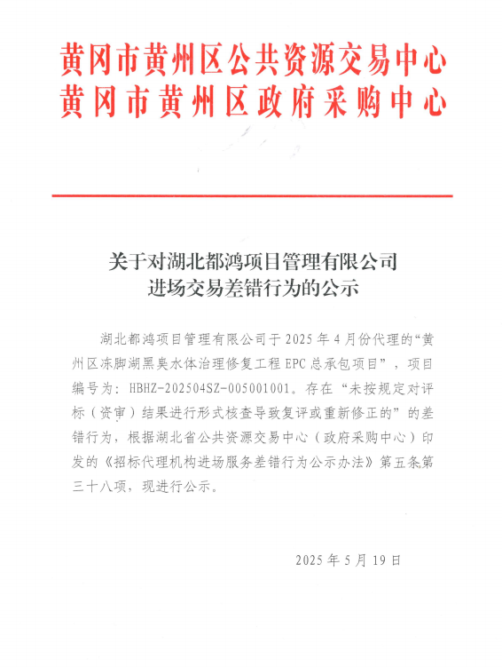 关于对湖北都鸿项目管理有限公司进场交易差错行为的公示