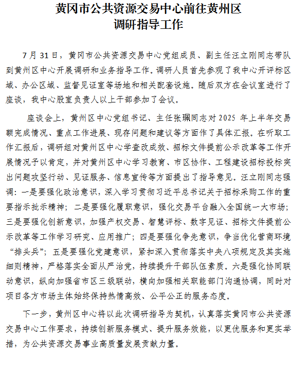 黄冈市公共资源交易中心前往黄州区调研指导工作