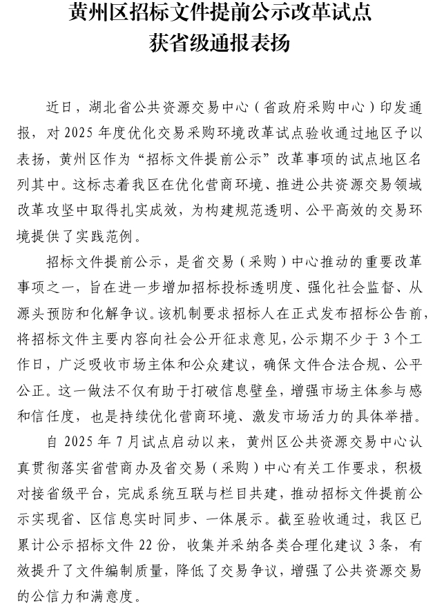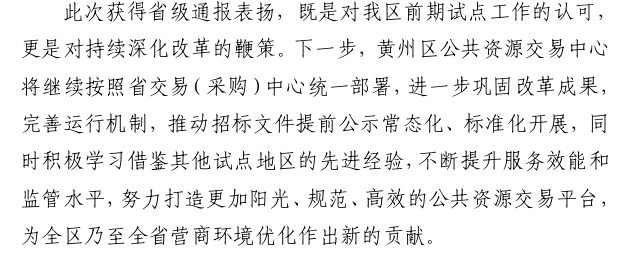 黄州区招标文件提前公示改革试点获省级通报表扬