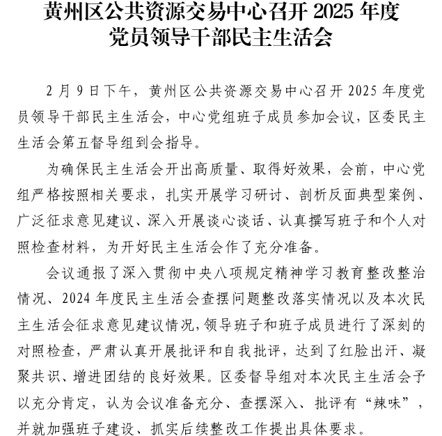 黄州区公共资源交易中心召开2025年度党员领导干部民主生活会