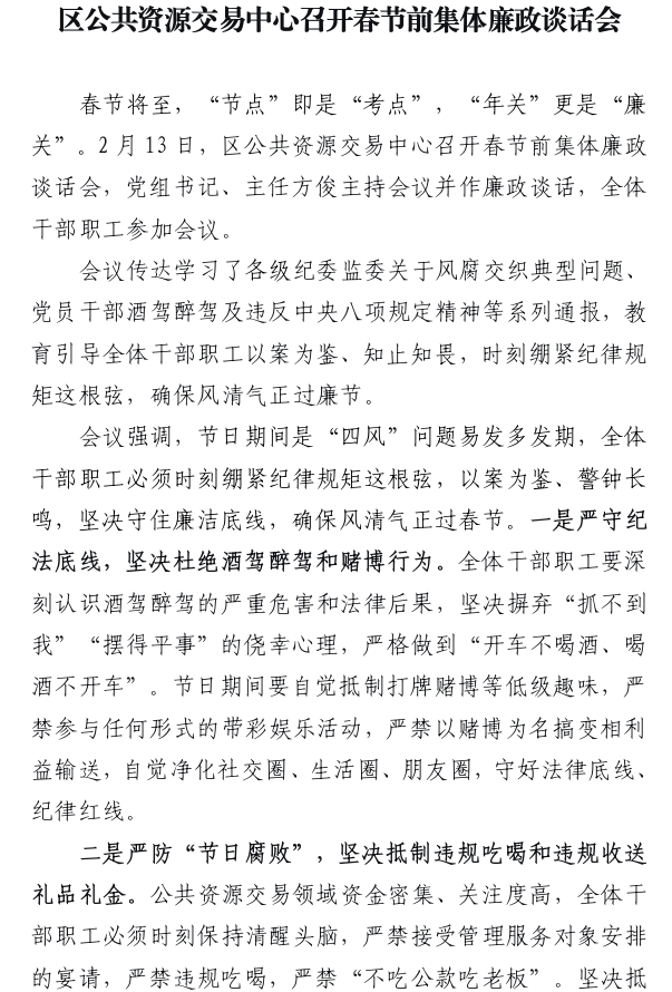 区公共资源交易中心召开春节前集体廉政谈话会