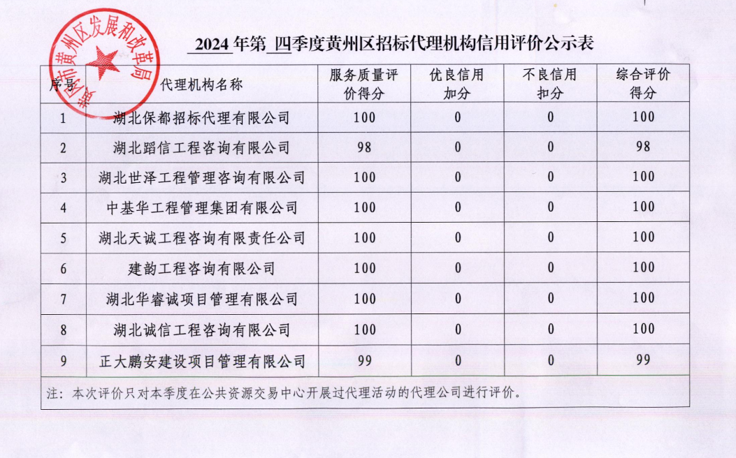 2024年第四季度黄州区招标代理机构信用评价公示表