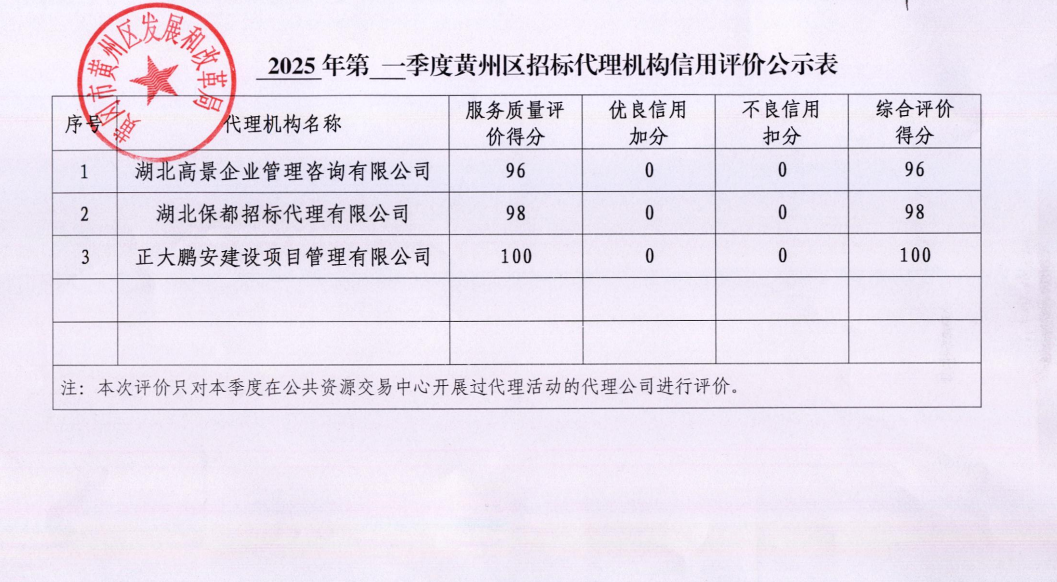 2025年第一季度黄州区招标代理机构信用评价公示表