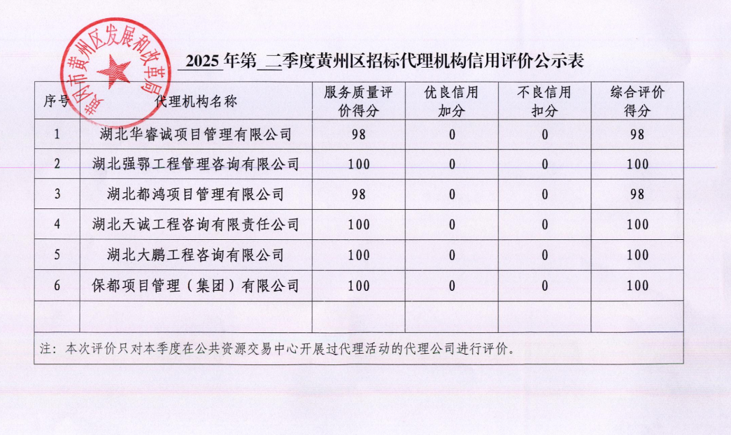 2025年第二季度黄州区招标代理机构信用评价公示表