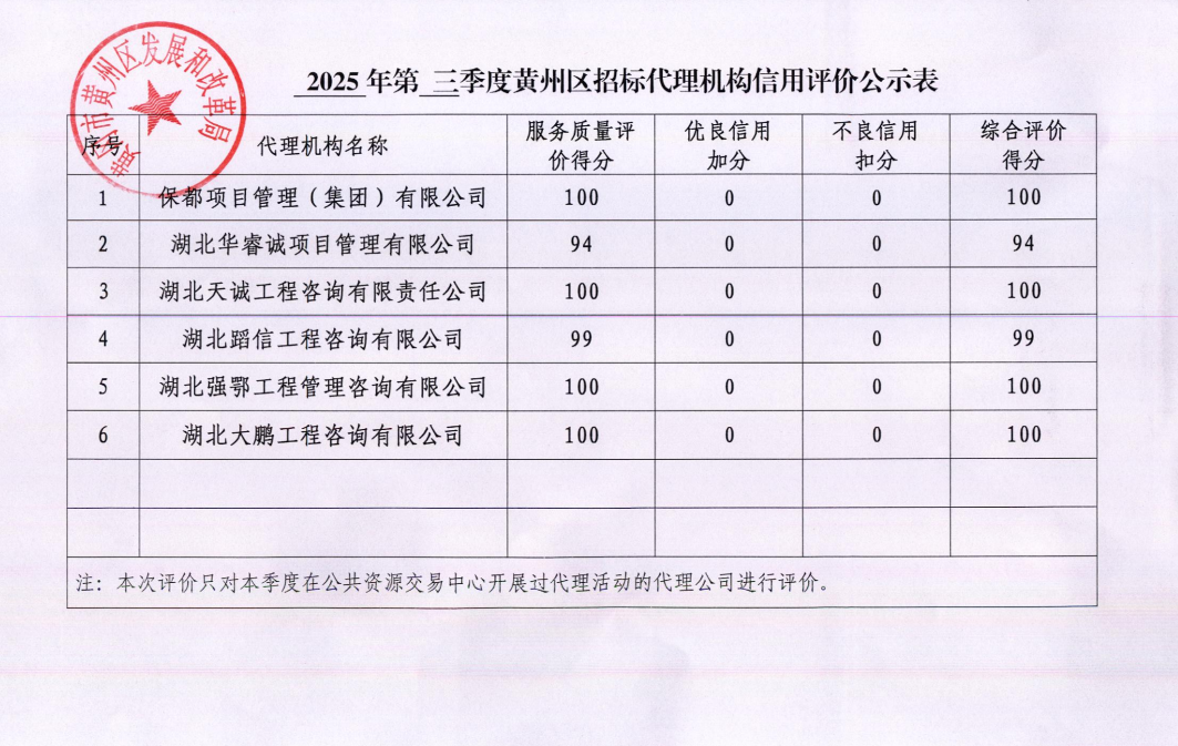 2025年第三季度黄州区招标代理机构信用评价公示表
